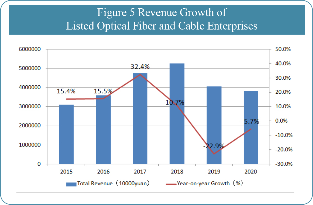 Besides, with the continuous impact of the epidemic and increased demand for consumption and entertainment, the demand for optical fiber and cable in China has been increasing. From 2015 to 2020, the number of netizens in China was close to 1 billion, and the penetration rate reached to 70.4%, displaying that the industry revenue and the growth rate of users shown a trend of slowing down year by year from high-speed growth and short-term fall to a stable and rising stage. Against such industry background, the revenue of China’s optical fiber and cable market kept growing with the revenue in 2020 reaching 37.5 billion yuan (see Figure 5). However, affected by the increasing downward pressure on the macro economy and the combined impact from macroeconomic environmental factors at home and abroad, the growth rate of the industry decreased from 15.4% in 2015 to - 5.7%, with an average annual growth rate of nearly 7.5 percentage points. It is predicted that China's optical fiber and cable industry will enter a period of steady growth (see Figure 6).