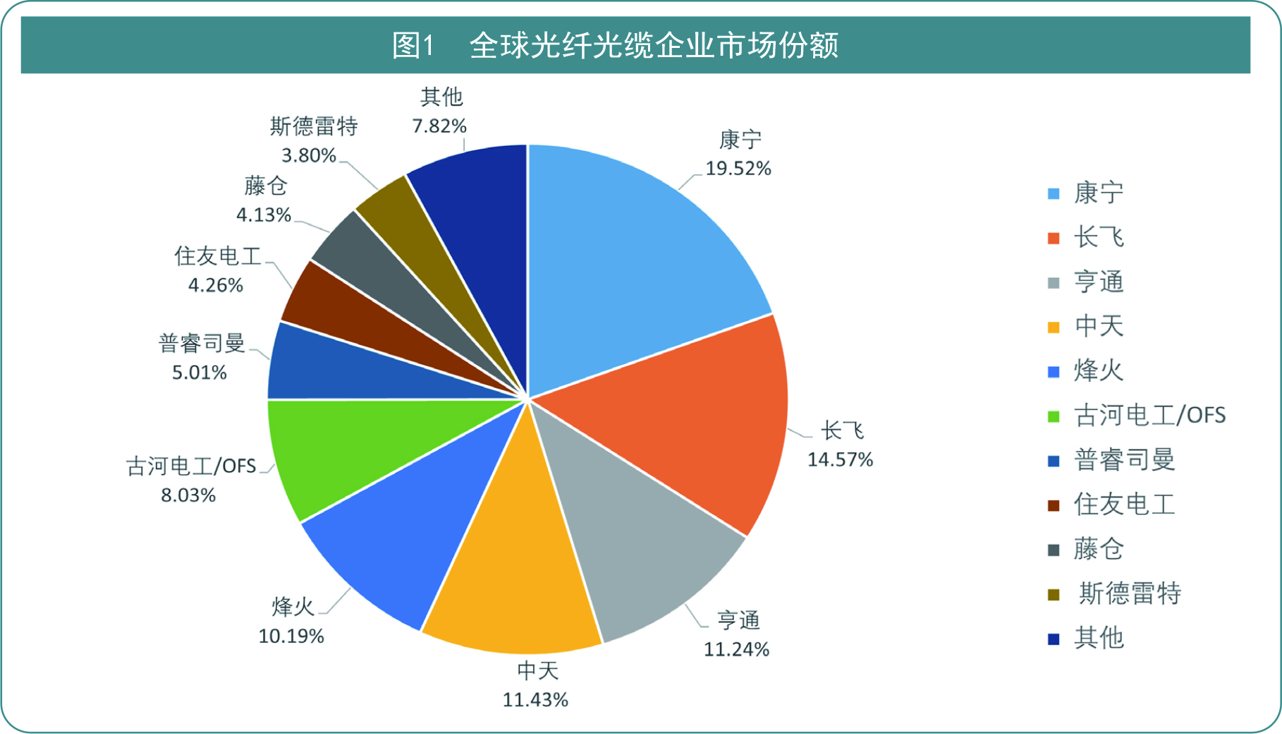 在全球光纤光缆榜单中,全球前十大厂商占据光纤光缆市场91.74%的市场份额,展现出强劲的竞争优势。10强企业由5个国家占据,分别来自美国(康宁)、中国(长飞、亨通、烽火、中天)、日本(古河电工/OFS、住友电工、藤仓)、意大利(普睿司曼)和印度(斯德雷特)。其中中国企业占据4个席位,分别占据14.57%、11.24%、11.43%、10.19%的全球市场份额。印度企业斯德雷特再次上榜,占据约3.80%的全球市场份额。