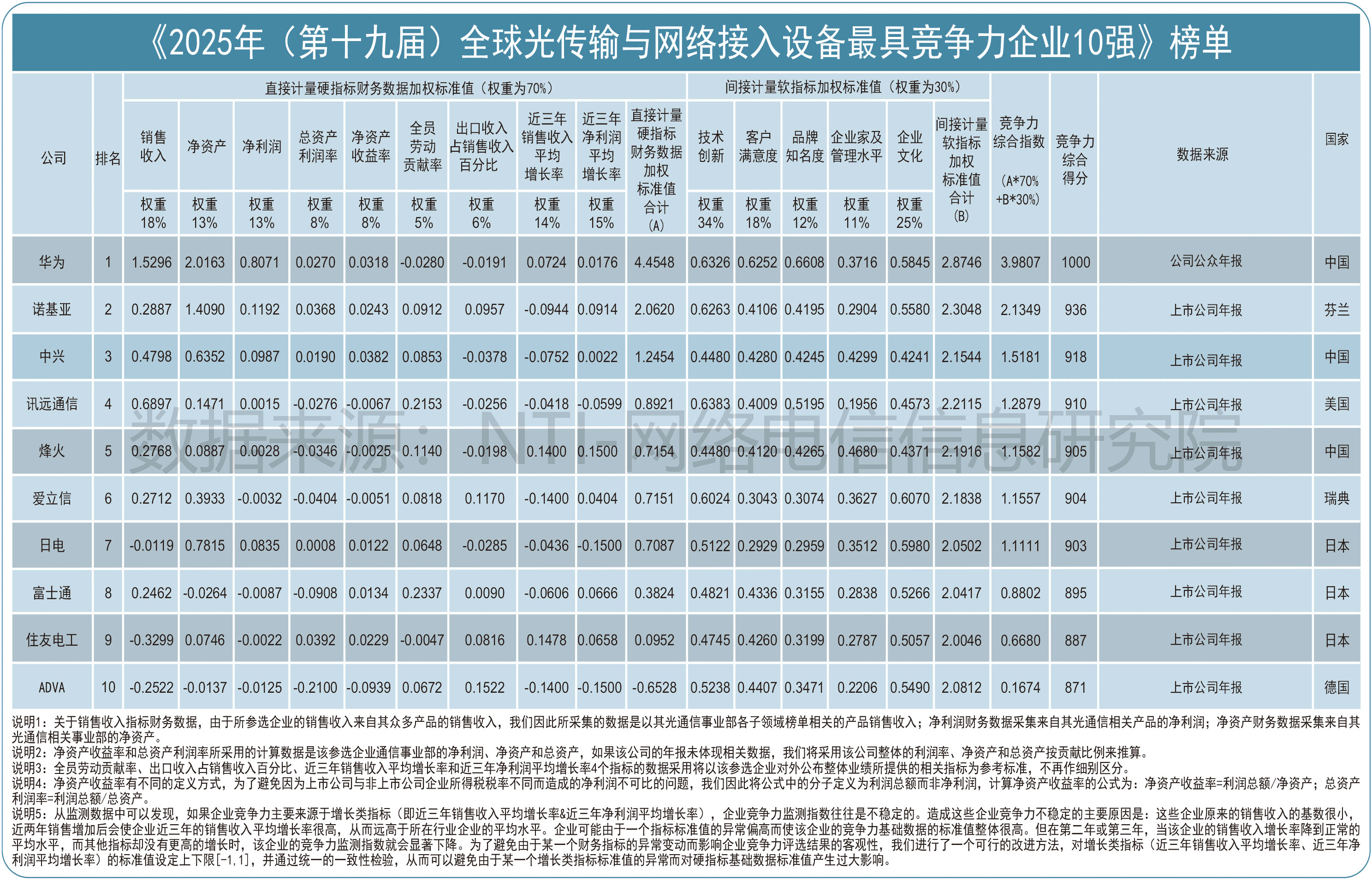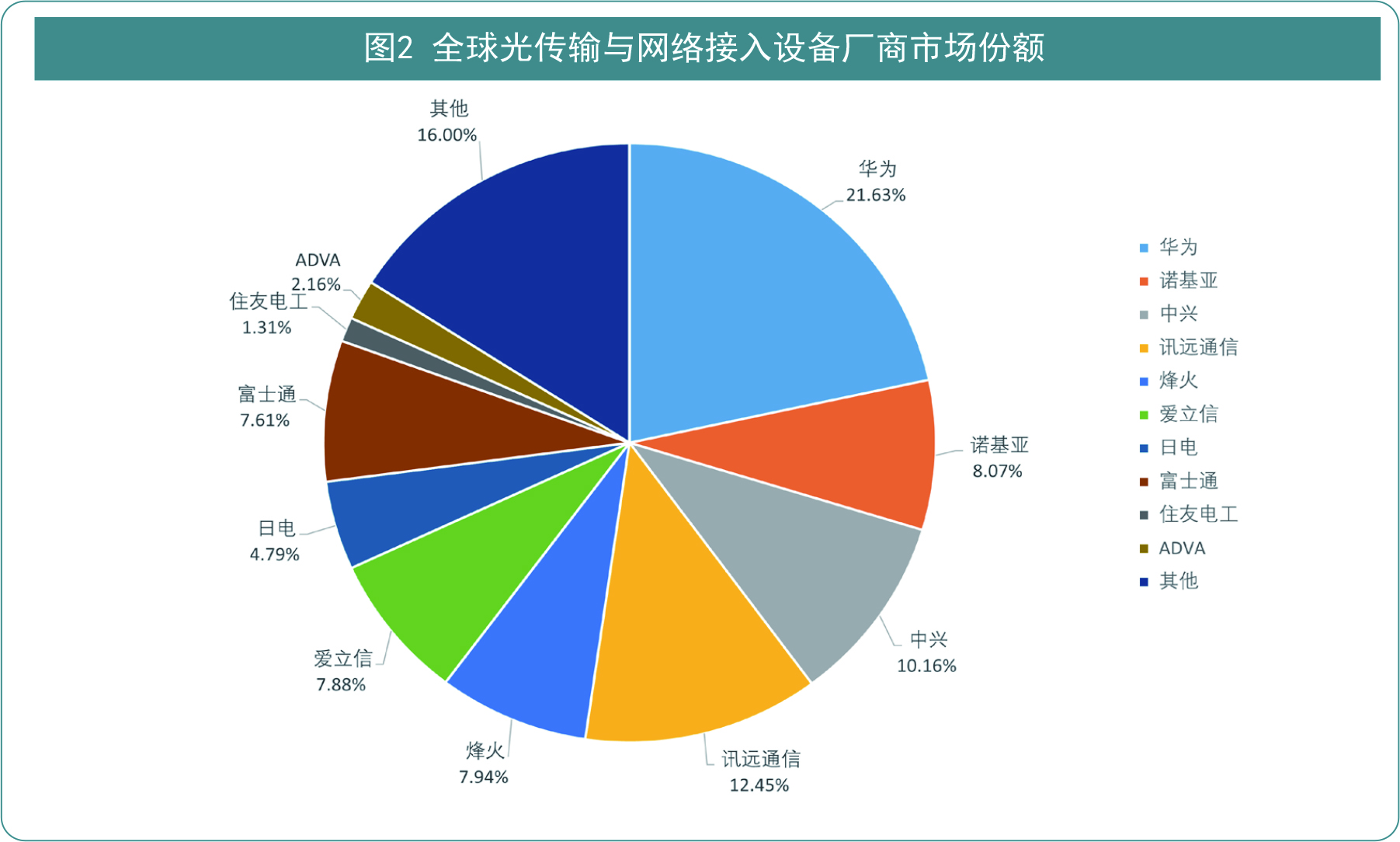 在光传输与网络接入设备领域,2025年全球市场竞争格局基本稳定,华为以21.63%的全球市场份额位居榜首,诺基亚、中兴、讯远通信、烽火分别以8.07%、10.16%、12.45%、7.94%的份额位列前五。中国企业华为竞争力指数达3.9807,领先优势显著。