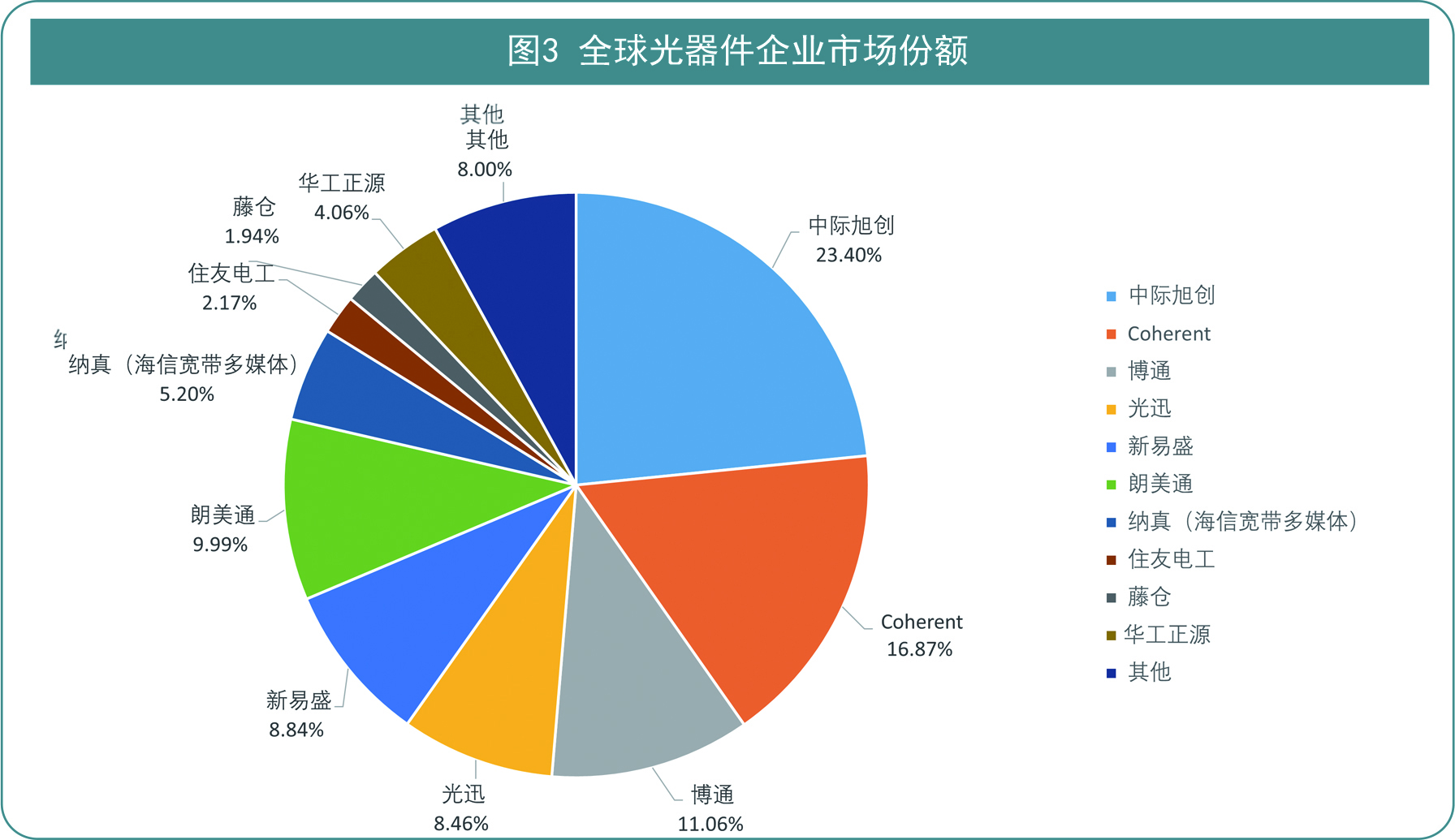 在2025全球光器件与光模块最具竞争力企业10强榜单中,中际旭创以23.40%的市场份额占据榜首,Coheren高意、博通、光迅、新易盛、朗美通分别以16.87%、11.06%、8.46%、8.84%和9.99%的市场份额居于榜单前六。详细全球光器件与光模块企业市场占有率见下图。