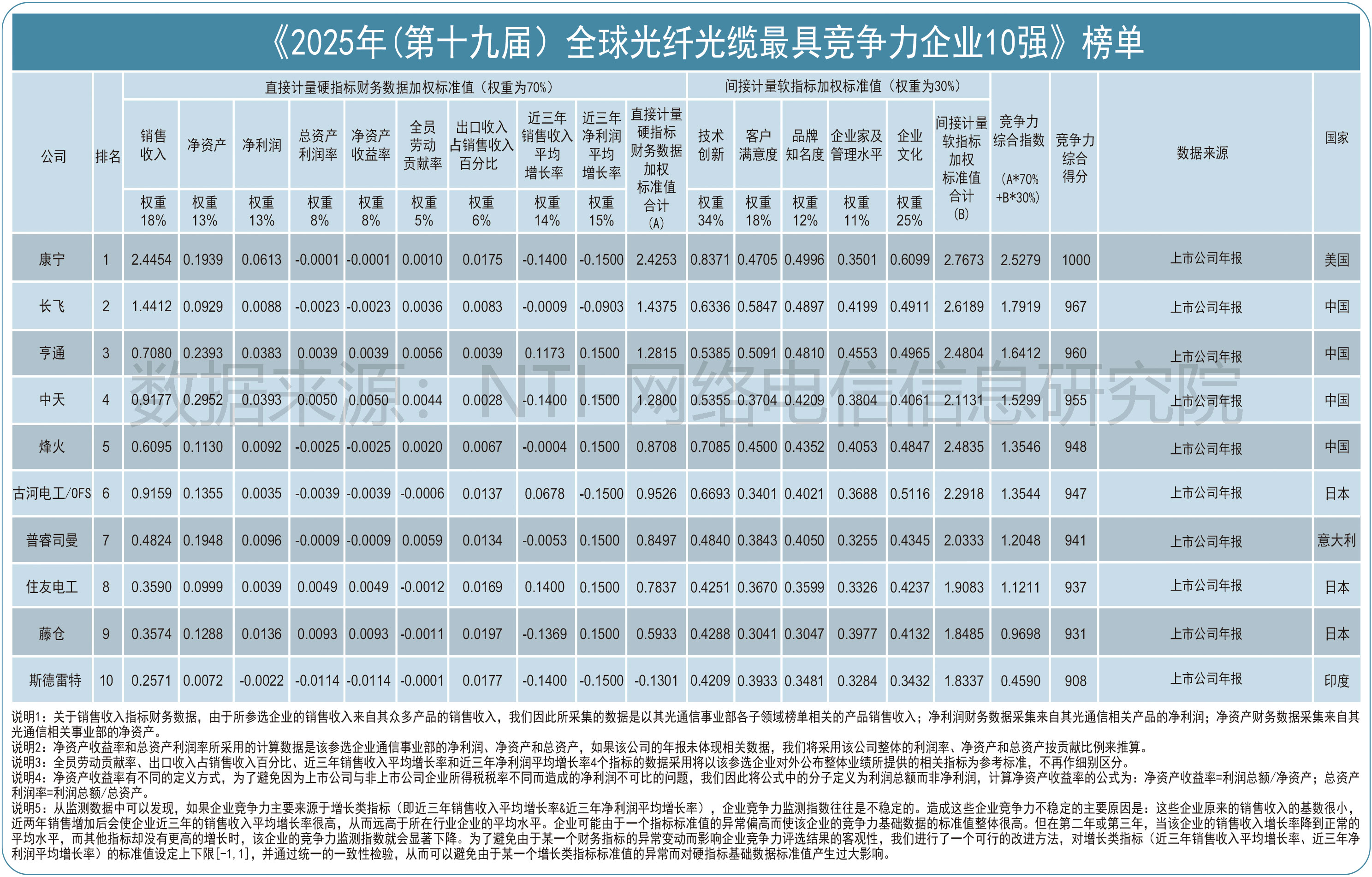 从企业的财务数据竞争力指数来看,美国企业康宁以2.4253的强劲竞争力指数遥遥领先,长飞和亨通以1.4375和1.2815的竞争力指数分列第二、第三,中天和烽火则以1.2800和0.8708的竞争力指数排名第四、第五,表现出强劲的市场竞争力。10强企业中的其它企业竞争力指数则相差不大,古河电工/OFS和烽火指数相差不到0.1,足见竞争之激烈。