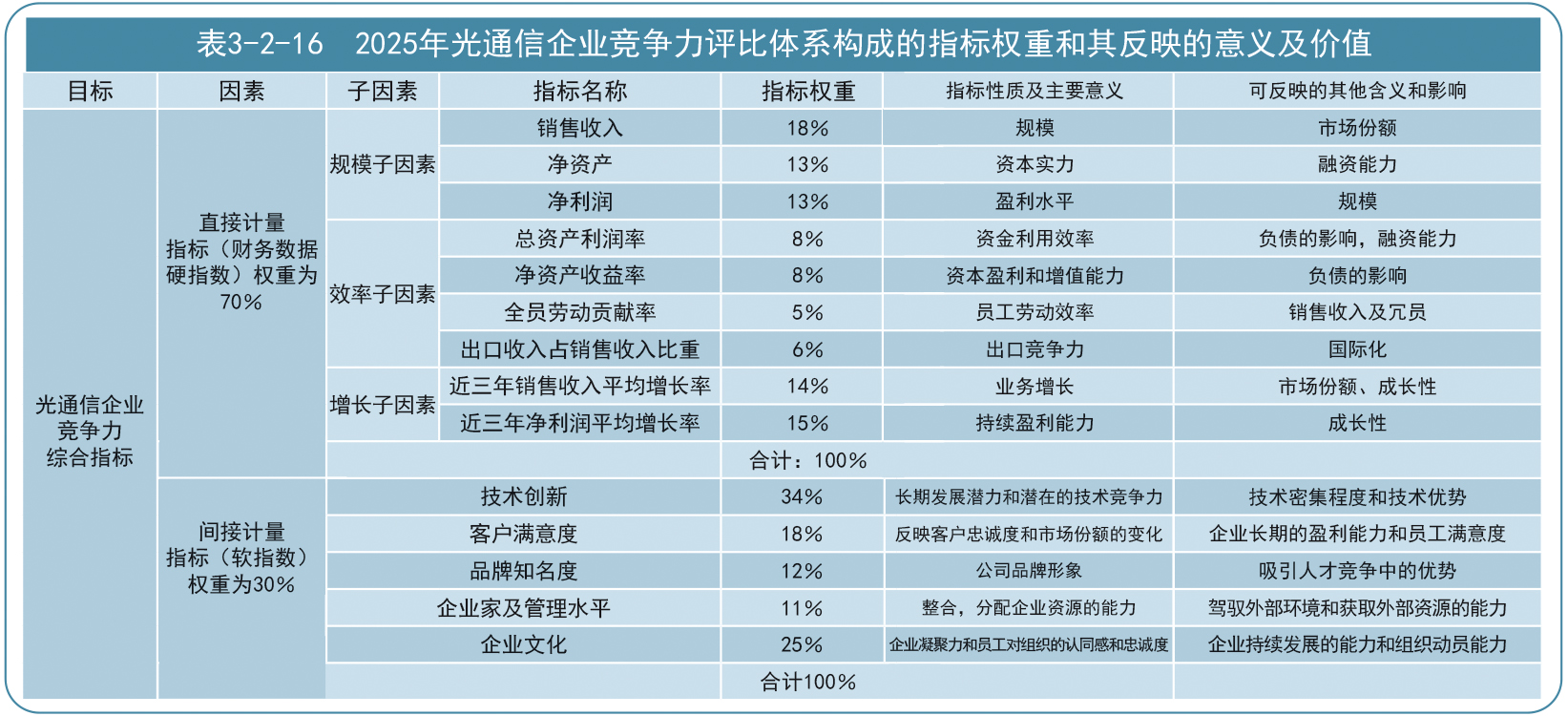 测评或监测指标分为两类:一类是可以直接计量的指标;另一类是难以直接计量的因素,比如说企业家的精神、企业的理念、管理水平、品牌价值,等等。其中,不能直接量化的因素,我们就希望用一些间接计量的指标来反映。这种间接计量的方法,一般通过对光通信行业各层面的问卷调查来实现。也就是说,我们承认竞争力因素中有一部分能够直接量化,也有一部分不能直接量化,而只能间接地量化。从企业竞争力测评的目的来看,测评指标要有综合性,指标数不要太多。也就是说,我们希望用数量不很多的测评指标就可以基本上把企业竞争力的结果反映出来,就像比赛打球一样,谁得分多谁就赢了,尽可能简单明了。
