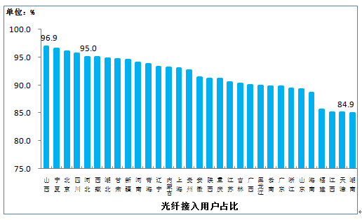 西部光纤接入用户渗透率小幅领先。截至7月底,东、中、西和东北部地区光纤接入用户分别达到17704万户、9499万户、10382万户和2439万户,占本地区固定互联网宽带接入用户总数的比重分别为90.2%、91.2%、92.9%、91.5%,西部地区占比小幅领先。各省光纤接入用户占比差异继续缩小,山西、宁夏、北京、四川和河北位居前五位,占比均超过95%。