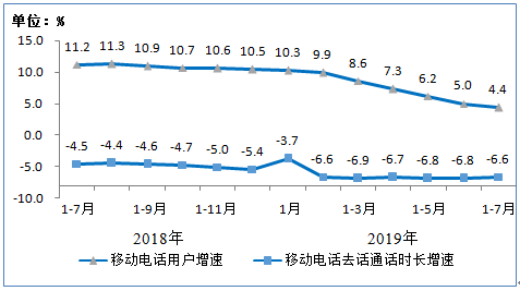 移动电话通话量持续下降。1-7月,移动电话去话通话时长完成14021亿分钟,同比下降6.6%,降幅较上年末扩大1.2个百分点,但比上半年收窄0.2个百分点;固定电话主叫通话时长完成719亿分钟,同比下降19.3%。