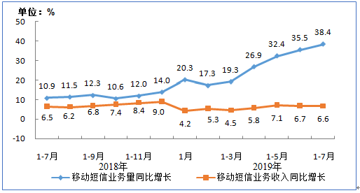 移动短信业务量和收入均保持较快增长。在服务登录和身份认证等服务普及带动下,短信业务的业务量和收入保持同步增长。1-7月,全国移动短信业务量同比增长38.4%,移动短信业务收入完成238亿元,同比增长6.6%。