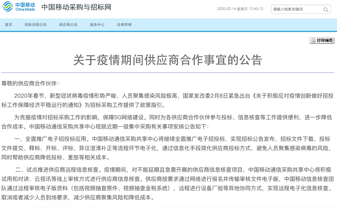 今日上午,中国移动采购与招标网发布一则面向一级采购供应商的重要公告--《关于疫情期间供应商合作事宜的公告》。