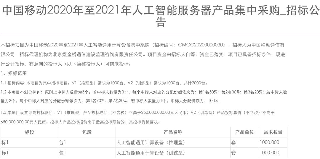 中国移动今日发布2020年至2021年人工智能服务器产品集中采购招标公告,招标内容为1000台V1(推理型),1000台V2(训练型),共计2000台。